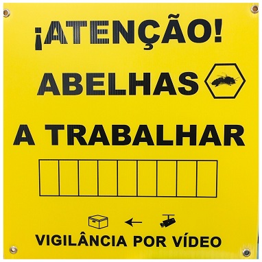 Cartel Atençao Abelhas con Aviso de Zona Videovigilada. Polipropileno amarillo resistente.