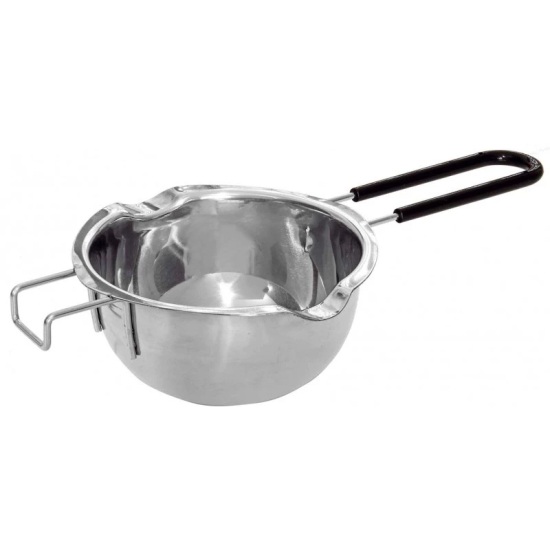Este recipiente para derretir cera de abeja al baño maría está fabricado en acero inoxidable y cuenta con soporte, 2 salidas y asa con revestimiento de silicona. Su diseño permite apoyarlo sobre ollas de Ø 12-26,5 cm, facilitando el proceso de fusión de la cera de forma segura. Longitud total aproximada 27 cm, Ø 14 cm, altura aproximada 6 cm.